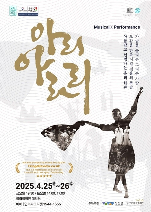 ‘아리아라리’는 전통음악, 무용, 연극, 영상이 결합된 복합 공연으로, 2018 평창 동계올림픽 문화예술 프로그램으로 초연됐다. 이후 2023년 호주 애들레이드 프린지 페스티벌에서 뮤지컬·연극 부문 최우수작품상을 수상하고, 2024년에는 세계 최대 공연예술 축제인 영국 에든버러 프린지 페스티벌에 참가해 별점 만점을 기록하며 아시아 공연예술의 새 지평을 열었다는 평가를 받았다.