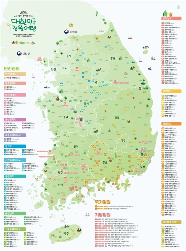 산림청은 따뜻한 봄을 맞아 국민들이 자연 속에서 여유를 즐길 수 있도록 ‘2025 대한민국 정원여행 지도’를 발간했다고 4월 23일 밝혔다. 이번 지도는 전국 172개 등록정원의 사진과 위치, 운영시간, 소개 등 실용적인 정보를 한눈에 확인할 수 있도록 구성됐다.