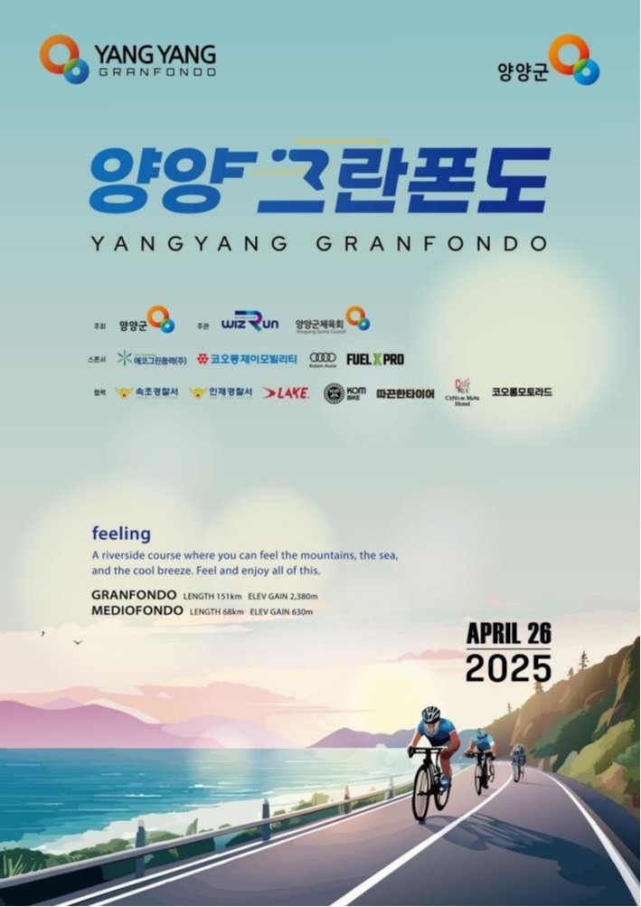 강원 양양군은 오는 4월 26일 양양군과 인제군 일원에서 자전거 마라톤 대회인 ‘2025 양양 그란폰도’를 개최한다고 밝혔다. ‘그란폰도(Gran Fondo)’는 이탈리아어로 ‘긴 거리’를 뜻하며, 장거리 자전거 라이딩을 즐기는 동호인들을 위한 대표적인 대회다.