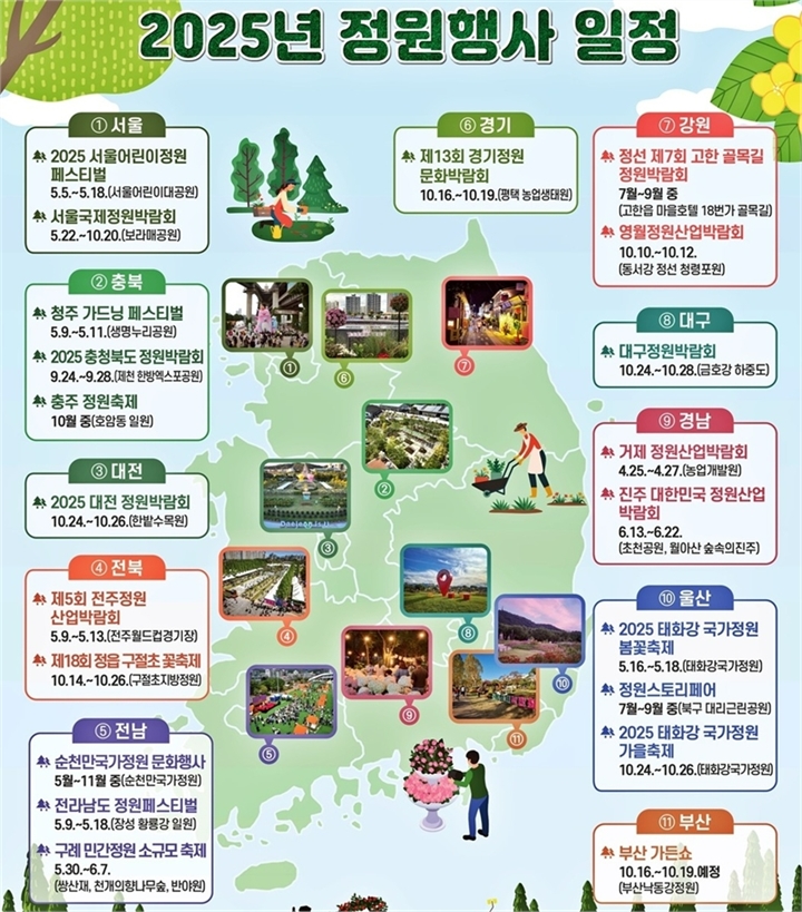 특히 주목받는 행사는 오는 6월 13일부터 22일까지 열리는 2025 대한민국 정원산업박람회다. 산림청과 경상남도, 진주시가 공동 주최하며, 총 106개 정원 관련 업체가 참여해 정원 소재와 첨단 기술을 소개하는 대규모 산업 박람회로 꾸며질 예정이다.