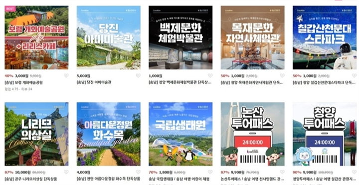 첫 단계로 할인 혜택이 적용되는 관광지는 보령 개화예술공원, 청양 백제문화체험박물관, 청양 목재문화자연사체험관, 칠갑산 천문대 스타파크, 서천 국립생태원 등 충남을 대표하는 명소들이다. 할인율은 40%에서 최대 70%까지 적용된다.