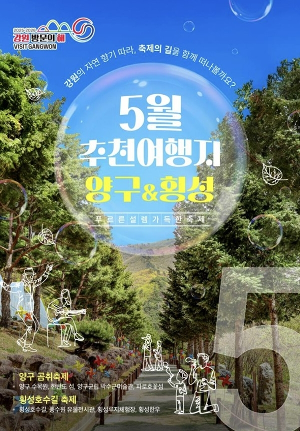 강원관광재단은 ‘2025~2026 강원 방문의 해’ 5월 추천 여행지로 횡성군과 양구군을 선정하고, 두 지역의 봄 축제를 중심으로 대대적인 홍보 마케팅을 전개한다고 밝혔다.