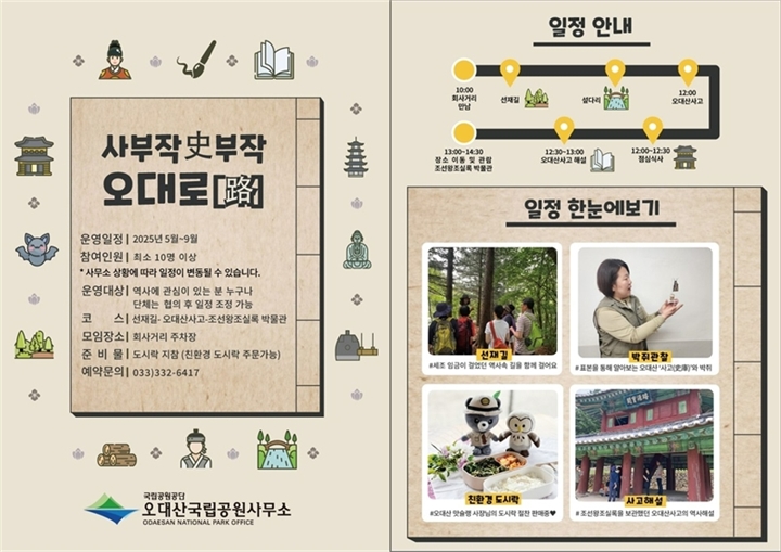 박용수 오대산국립공원사무소 탐방시설과장은 "오대산의 역사와 문화를 재조명하는 의미 있는 생태관광 프로그램에 많은 관심과 참여를 부탁드린다"고 말했다.