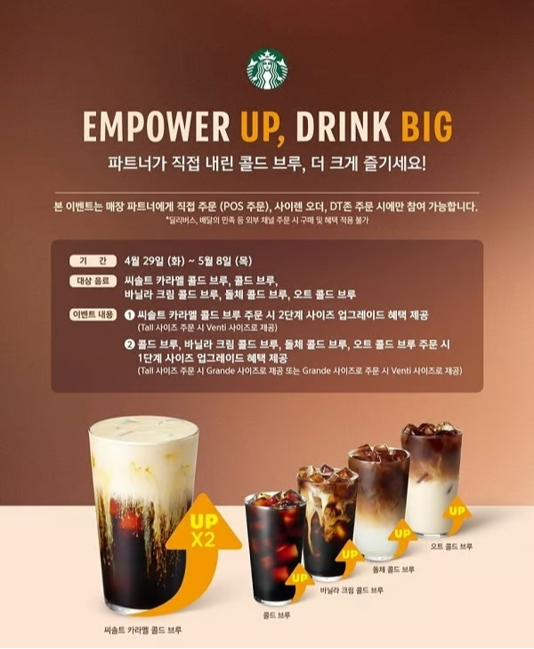 이벤트 대상 음료는 씨솔트 카라멜 콜드브루, 콜드브루, 바닐라 크림 콜드브루, 돌체 콜드브루, 오트 콜드브루 등 총 5종이다. 콜드브루, 바닐라 크림 콜드브루, 돌체 콜드브루, 오트 콜드브루는 한 단계 사이즈업이 적용되며, 이달의 프로모션 음료인 씨솔트 카라멜 콜드브루는 두 단계 사이즈업 혜택이 제공된다. 이에 따라 벤티 사이즈 음료를 톨 사이즈 가격에 즐길 수 있다.
