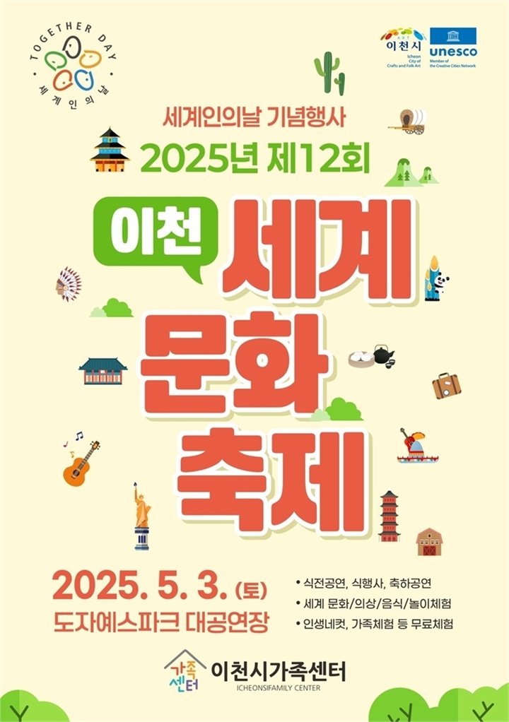 이천시(시장 김경희)는 오는 5월 3일(토) 이천도자예술마을(예스파크) 대공연장에서 ‘제12회 이천세계문화축제’를 개최한다고 밝혔다. 이번 축제는 세계인의 날을 기념해 이천시민과 외국인 주민이 함께 어우러지는 다채로운 문화 교류의 장으로 마련됐다.
