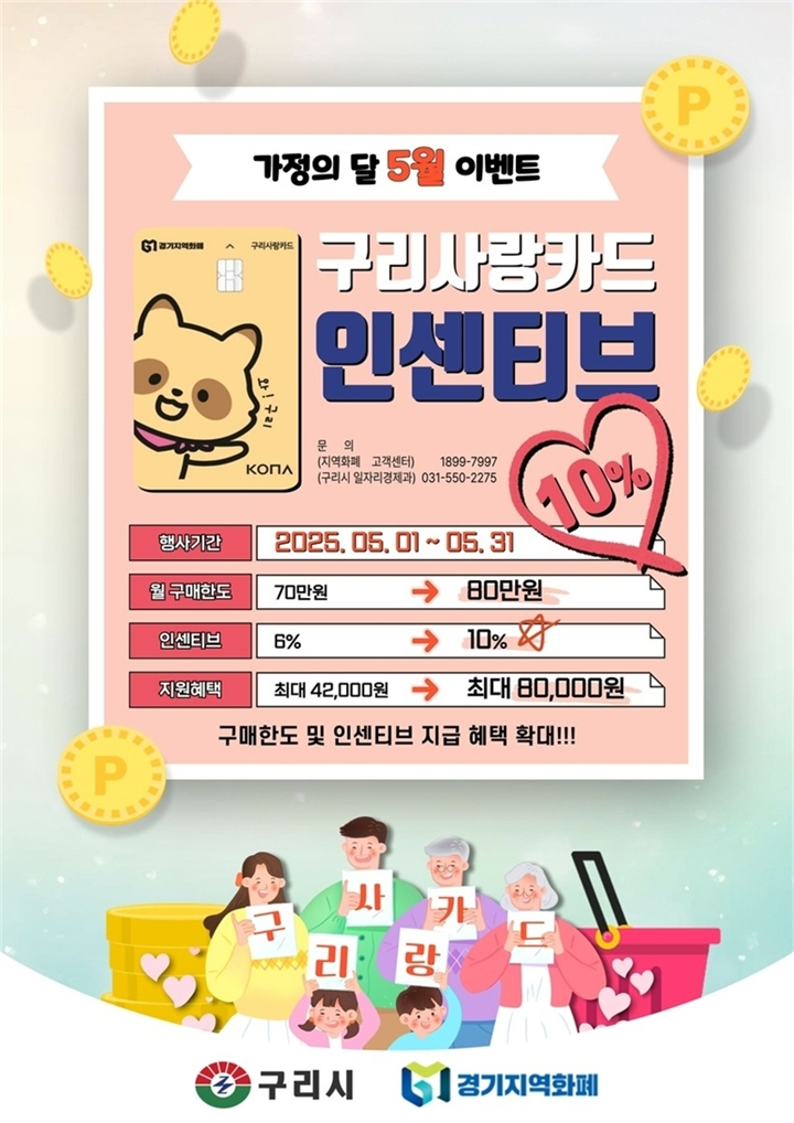 구리시(시장 백경현)는 5월 가정의 달을 맞아 지역 화폐인 ‘구리사랑상품권(구리사랑카드)’의 특별 인센티브를 기존 6%에서 10%로 확대 지원한다고 밝혔다. 이번 인센티브 확대는 월 구매 한도 80만 원까지 적용되며, 가정 내 지출이 집중되는 5월의 경제 부담을 줄이기 위한 조치다.