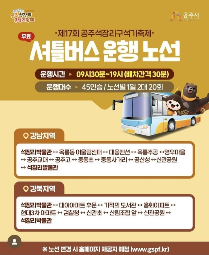 시는 45인승 셔틀버스 4대를 투입해 강북(신관)과 강남(시내) 지역을 연결하는 2개 순환 노선을 오전 9시 30분부터 오후 7시까지 30분 간격으로 운영한다. 강북 노선은 대아아파트 후문, 기적의 도서관, 흥화아파트, 현대3차 아파트, 검찰청, 신관초등학교, 산림조합, 신관공원을 거쳐 석장리박물관까지 이어지며, 강남 노선은 옥룡동 어울림센터, 대웅멘션, 옥룡주공아파트, 영우마을, 공주교육대, 공주고, 중동초, 중동사거리, 공산성, 신관공원을 경유한다.