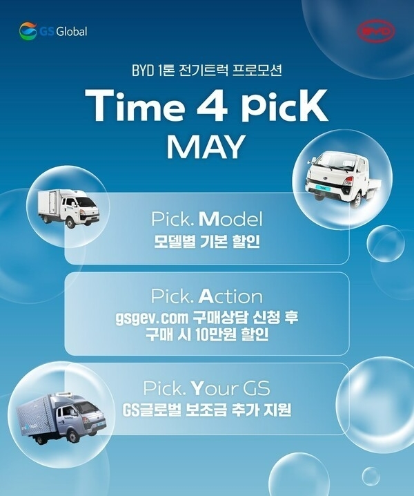 GS글로벌이 5월 한 달간 BYD 1톤 전기트럭 T4K 구매 고객을 대상으로 대폭 확대된 구매 지원 혜택을 제공하는 특별 프로모션을 진행한다. 이번 행사는 2024년형과 2025년형 T4K 모델 모두를 대상으로 하며, 전기트럭 도입을 고민하던 고객들에게 합리적인 구매 기회를 제공한다.