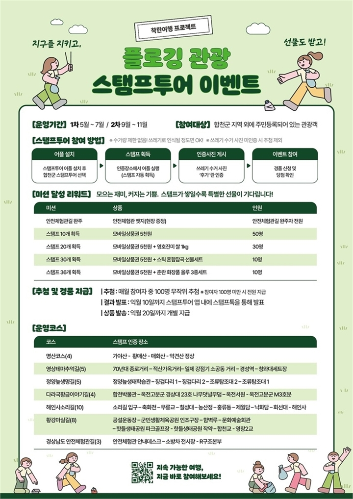 합천군은 5월부터 조깅이나 걷기 활동과 쓰레기 줍기를 결합한 친환경 프로그램 ‘플로깅 관광 스탬프투어’를 시작했다고 밝혔다. 이번 사업은 합천의 자연을 즐기며 환경보호에 동참할 수 있는 웰니스 관광 콘텐츠로 기획됐다.