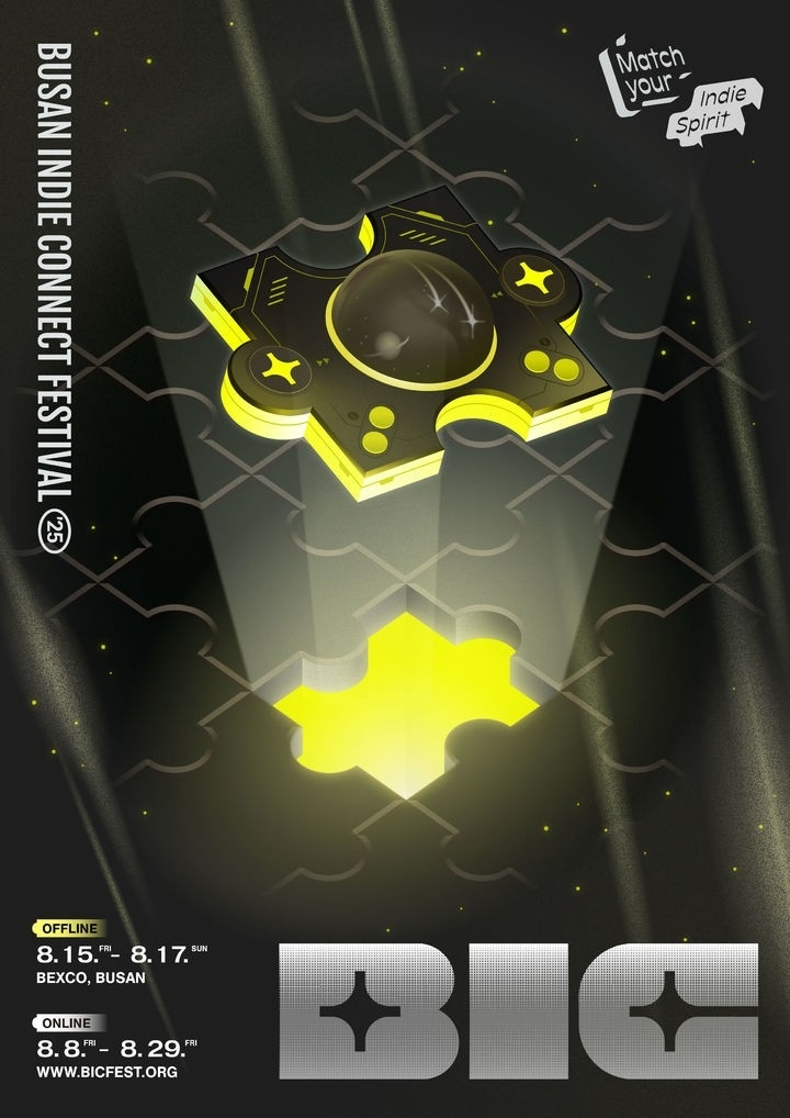 공개된 이미지는 퍼즐 판 위에 착지하는 우주선 모양의 퍼즐 조각을 통해 개발자와 게이머, 관람객이 자연스럽게 끌리는 ‘매칭’의 순간을 형상화했다. 퍼즐 판은 BIC만의 세계관인 ‘유니버스인디(UNIVERSE-INDIE)’를 상징하며, 퍼즐 조각이 정확히 자리를 찾는 모습은 BIC 2025가 새로운 출발점이자 연결점이 된다는 메시지를 담고 있다.