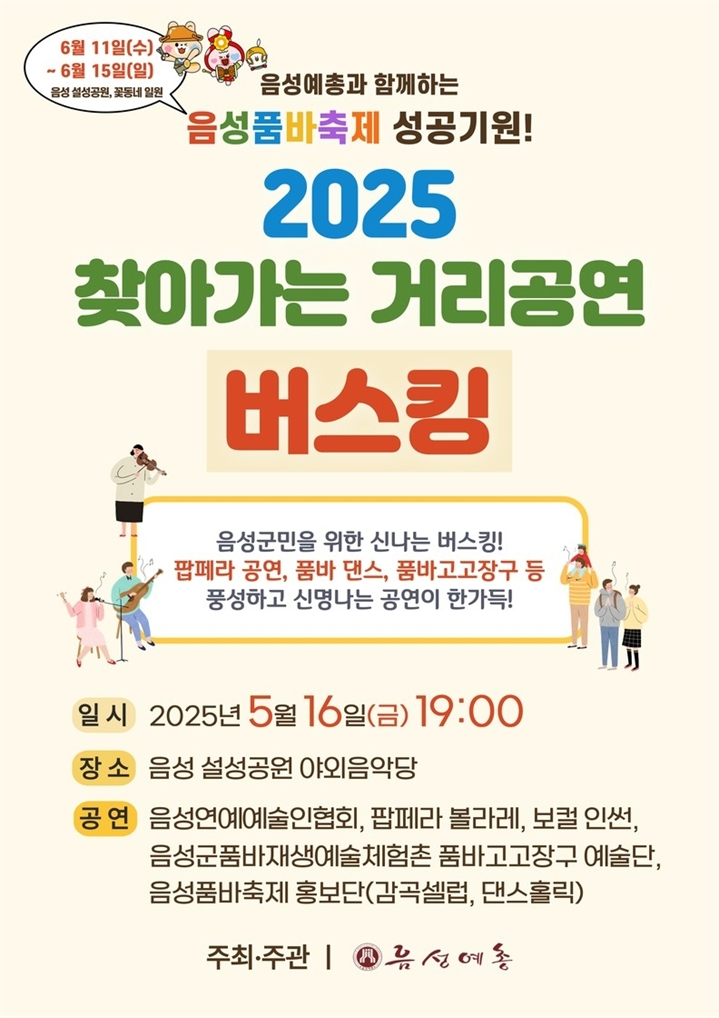 버스킹 무대에는 음성연예예술인협회의 팝페라 팀 ‘볼라레’, 보컬 인썬, 품바고고장구예술단, 음성품바축제 홍보단(댄스홀릭, 감곡셀럽) 등이 참여해 흥겨운 무대를 선보일 예정이다. 특히 관객과의 소통을 중시한 자유로운 형식의 공연으로 남녀노소 누구나 함께 즐길 수 있는 시간이 될 것으로 기대된다.