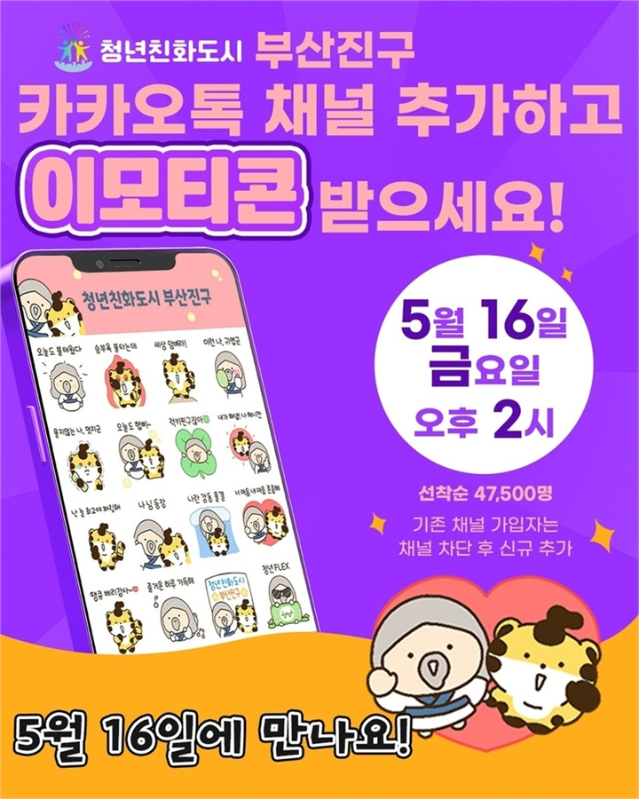 부산 부산진구(구청장 김영욱)는 5월 16일 오후 2시부터 ‘청년친화도시 부산진구’를 주제로 제작한 카카오톡 이모티콘을 선착순으로 배포한다고 밝혔다.