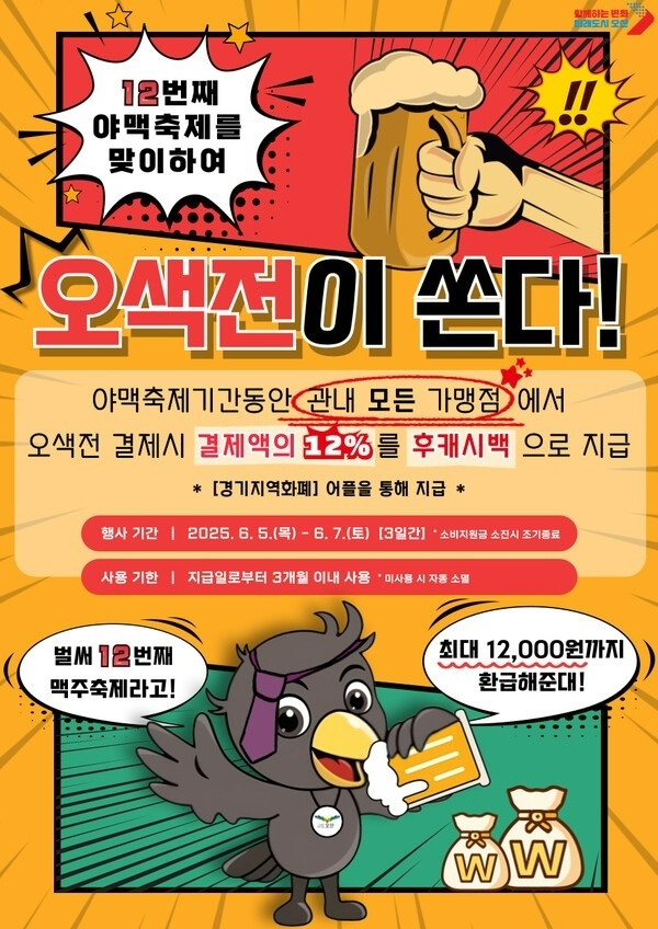 오산시는 오는 6월 5일부터 7일까지 열리는 제12회 야맥축제를 맞아, 지역화폐 ‘오색전’ 사용자에게 12% 캐시백을 제공하는 특별 이벤트를 진행한다고 밝혔다.
