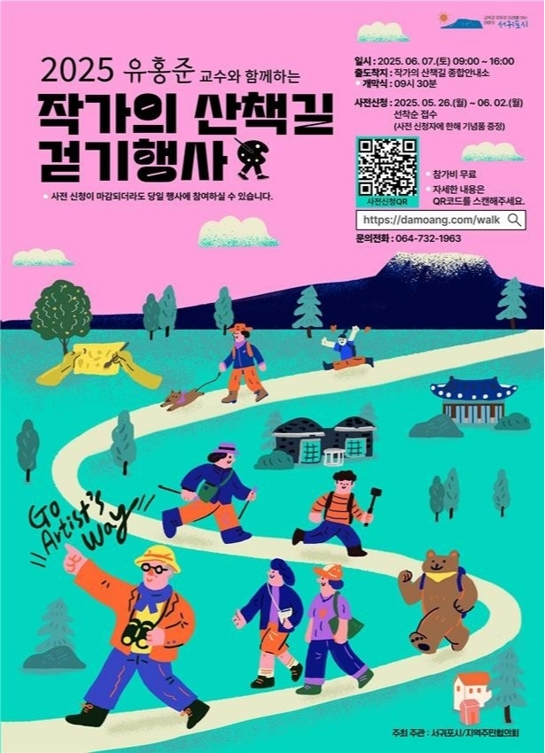 ‘작가의 산책길’은 서귀포시가 주최하고 지역주민협의회가 주관하는 행사로, 참가자들은 유 교수와 함께하는 특별코스(150명)와 A코스(100명), B코스(100명) 중 선택해 신청할 수 있으며 총 350명을 모집한다. 신청은 5월 26일 오전 10시부터 6월 2일까지며, 서귀포문화예술포털(https://culture.seogwipo.go.kr/) 또는 서귀포시 누리집(https://www.seogwipo.go.kr/)을 통해 온라인으로 신청 가능하다. 홍보 포스터나 리플릿의 QR코드를 통해서도 쉽게 접속할 수 있다.