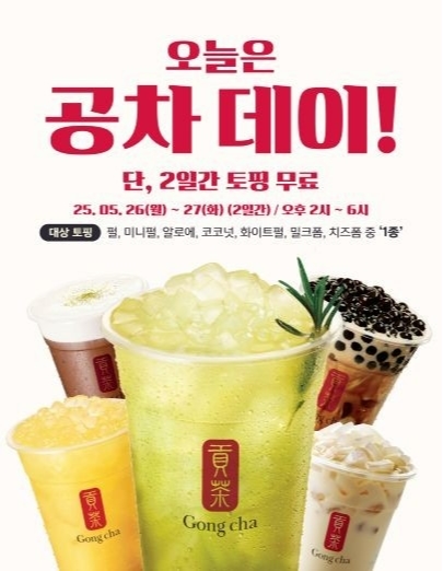 공차코리아는 5월 26일부터 27일까지 이틀간 전국 매장에서 ‘공차 데이’ 프로모션을 실시한다고 밝혔다. 이번 이벤트는 오후 2시부터 6시까지 진행되며, 행사 시간 내 L사이즈 ICE 음료를 구매한 고객에게 토핑 1종을 무료로 제공하는 혜택을 제공한다.