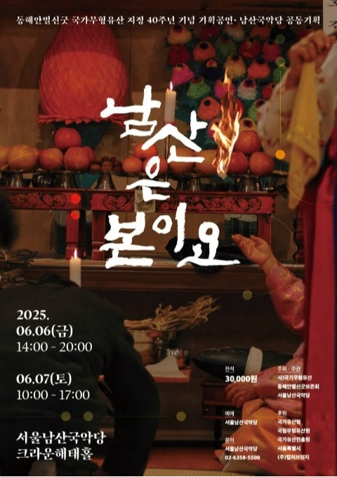서울남산국악당과 동해안별신굿보존회가 공동기획한 전통예술 공연 ‘동해안별신굿: 남산은 본이요’가 6월 6일과 7일 이틀간 서울남산국악당 크라운해태홀에서 열린다. 이번 공연은 국가무형문화재인 ‘동해안별신굿’의 지정 40주년과 초대 예능보유자 고(故) 김석출 명인의 타계 20주기를 기념해 전통 무속예술의 가치를 조명하고자 마련됐다.