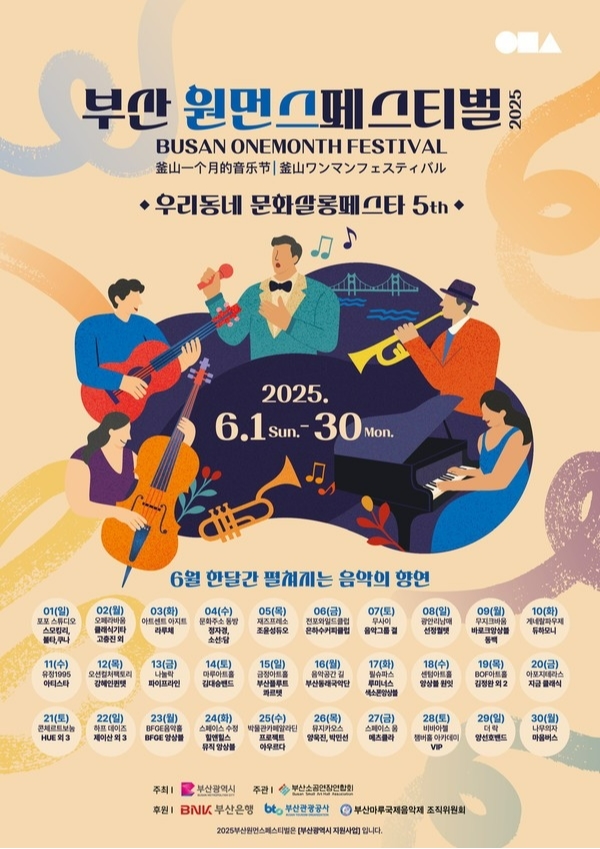 부산의 일상을 음악으로 채우는 대규모 문화축제 ‘2025 부산원먼스페스티벌’이 오는 6월과 11월, 두 차례에 걸쳐 부산 전역에서 개최된다. 총 40여 개 소공연장과 70여 개 공연팀, 330여 명의 예술인과 220여 명의 예술 종사자가 참여하는 이 축제는 부산을 대표하는 음악 도시로서의 면모를 한층 강화할 예정이다.
