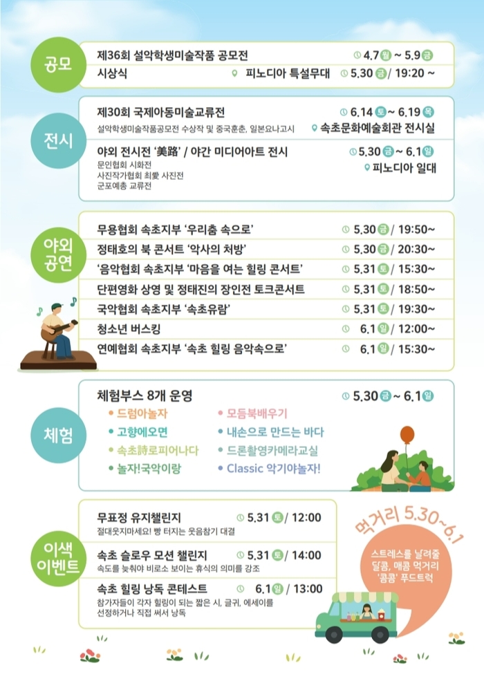 축제의 시작을 알리는 개막식은 5월 30일 저녁 7시 행사장 특설무대에서 열리며, 축하 공연과 함께 ‘2025 설악학생 미술작품 공모전’ 시상식이 함께 진행된다.