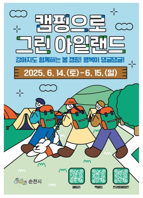 전남 순천시(시장 노관규)는 오는 6월 14일부터 15일까지 이틀간 그린 아일랜드 및 오천 그린광장 분수대 일원에서 ‘2025 캠핑으로 그린 아일랜드’ 행사를 개최한다고 밝혔다.