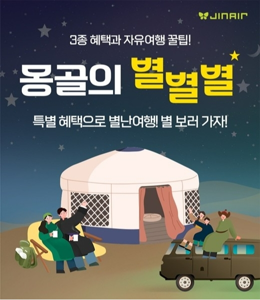 진에어 관계자는 “몽골은 대자연과 도시 풍경이 어우러진 독특한 매력을 가진 여행지로, 약 4시간의 비행 거리로 부담 없이 즐길 수 있다”며 “다양한 할인 혜택과 함께 진에어가 추천하는 여행 코스를 참고해 색다른 몽골 여행을 계획해보시길 바란다”고 전했다.