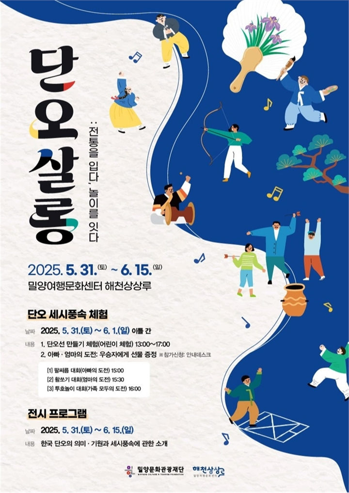 경남 밀양문화관광재단은 우리 고유의 전통 명절인 단오(음력 5월 5일)를 맞아, 밀양여행문화센터 해천상상루에서 ‘단오살롱: 전통을 입다, 놀이를 잇다’를 주제로 한 기획 프로그램을 5월 31일부터 6월 1일까지 양일간 운영한다고 밝혔다.