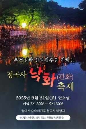 경남 진주시 금산면 월아산 자락에 자리한 대한불교 조계종 청곡사가 오는 5월 31일(금) 오후 7시 30분부터 2시간 동안 사찰 입구 학영지에서 ‘2024 청곡사 낙화축제’를 처음으로 개최한다. 이번 축제는 부처님과 조선 태조 이성계의 비인 신덕왕후를 기리며, 고려 시대부터 전해 내려오는 전통 불교문화 ‘관화(觀火)’ 의식을 현대적으로 재해석한 행사다.