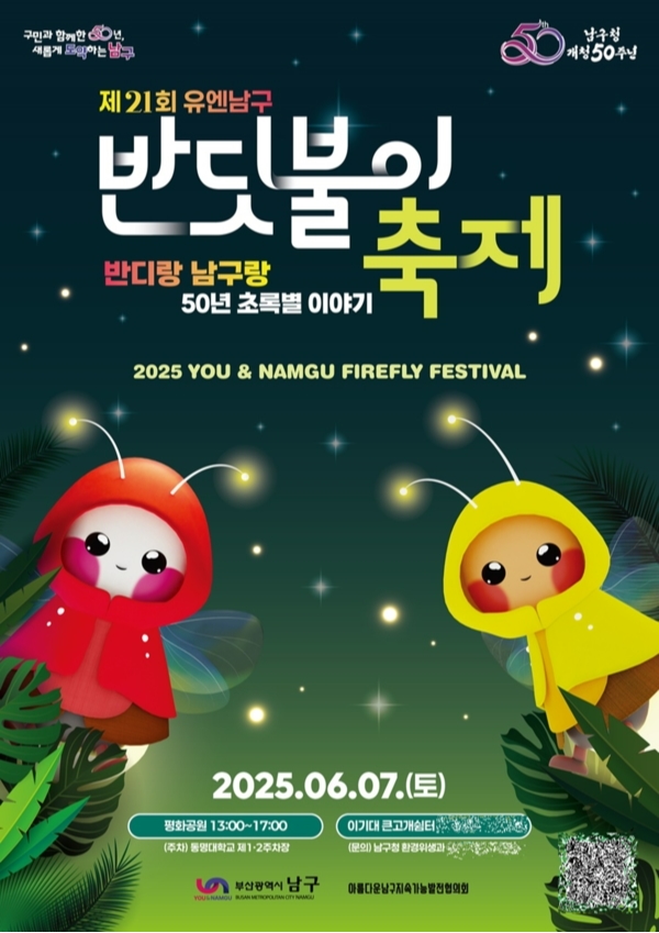 부산 남구는 오는 6월 7일 평화공원과 이기대 큰고개쉼터 일원에서 제21회 ‘유엔남구 반딧불이 축제’를 개최한다고 밝혔다. 올해 축제는 남구청 개청 50주년을 기념해 ‘반디랑 남구랑 50년 초록별 이야기’를 주제로, 반딧불이와 함께 걸어온 시간과 앞으로 공존할 미래를 그린다.
