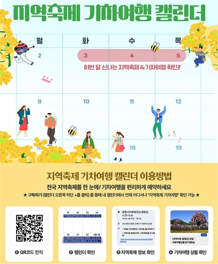 이민성 고객마케팅단장은 “모바일 캘린더 서비스를 통해 고객이 손쉽게 지역축제와 기차여행을 연계할 수 있도록 했다”며 “지역 관광 활성화에도 실질적인 도움이 되길 기대한다”고 밝혔다.