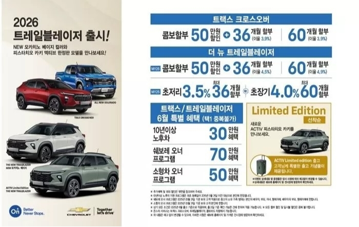 트랙스 크로스오버: 3.9% 이율 최대 60개월 할부 + 현금 50만 원 지원. 2024년 1월 이전 생산 차량 구매 시 유류비 30만 원 추가 지원.
