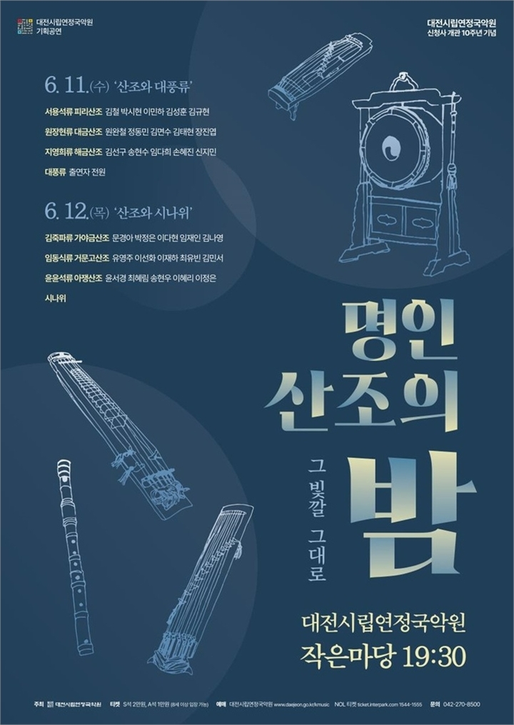 대전시립연정국악원은 신청사 개관 10주년을 기념해 국악 명인들을 초청한 특별 기획공연 ‘명인 산조의 밤(그 빛깔 그대로)’을 오는 6월 11일부터 12일까지 이틀간 개최한다고 밝혔다.
