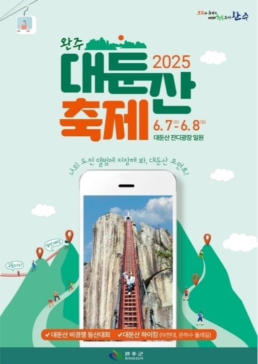 2025 완주 대둔산 축제가 오는 6월 7일부터 8일까지 ‘너의 도전 앨범에 저장해 봐, 대둔산 모먼트!’라는 슬로건 아래 이틀간의 다채로운 축제 일정으로 대둔산 일대에서 열린다. 웅장한 산세를 배경으로 펼쳐지는 이번 축제는 공연, 먹거리, 체험 프로그램 등으로 구성돼 방문객들에게 자연 속 특별한 추억을 선사할 예정이다.