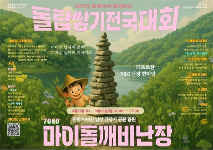 주요 행사인 ‘돌탑 쌓기’는 진안을 주제로 창의적인 돌탑을 제작하는 참여형 프로그램으로, 전문부·가족·학생부·자유부로 나뉘어 2~4인 단위 팀으로 참여할 수 있다. 전통 놀이 체험도 마련돼 비석치기, 사방치기, 공기놀이 등 고전 놀이는 물론, 복고풍 의상 체험, 엿 뽑기, 달고나 만들기 등 추억을 소환하는 체험 콘텐츠가 다채롭게 펼쳐진다.