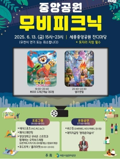 조소연 이사장은 “중앙공원 무비 피크닉은 세종 시민들이 일상 속에서 문화를 누릴 수 있도록 기획된 열린 행사로, 세종시의 문화도시 이미지를 널리 알리고 공공공간의 활용 가치를 높이는 계기가 될 것”이라며 “가족, 친구, 연인과 함께 피크닉처럼 즐거운 하루를 보내시길 바란다”고 전했다.