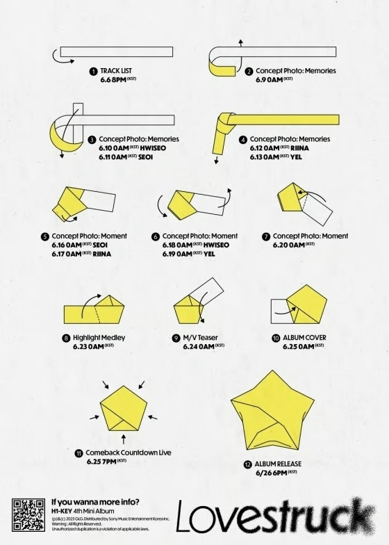 걸그룹 하이키(H1-KEY, 서이·리이나·휘서·옐)가 별을 담은 감성적인 콘셉트와 함께 미니 4집 ‘Lovestruck’으로 컴백을 알렸다. 소속사는 6일 0시 공식 SNS를 통해 종이접기 콘셉트로 구성된 프로모션 캘린더를 공개하며 본격적인 컴백 카운트다운에 돌입했다.