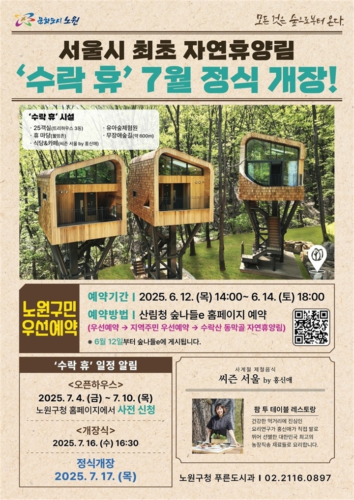수락 휴의 숙박 예약은 산림청 ‘숲나들e’ 홈페이지를 통해 가능하며, 개장일 기준 첫 예약은 16일부터 시작된다. 노원구민은 12일 오후 2시부터 14일 오후 6시까지 10% 할인된 요금으로 우선 예약할 수 있다.