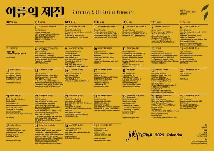 공연기획사 더하우스콘서트가 7월 한 달 동안 ‘2025 줄라이 페스티벌 – 여름의 제전’을 개최한다고 밝혔다. 매년 여름 열리는 이 축제는 작곡가의 생애와 작품 세계를 집중 조명하는 클래식 음악 축제로, 올해는 20세기 음악사의 혁신가 이고르 스트라빈스키와 러시아 작곡가들이 주인공이다.