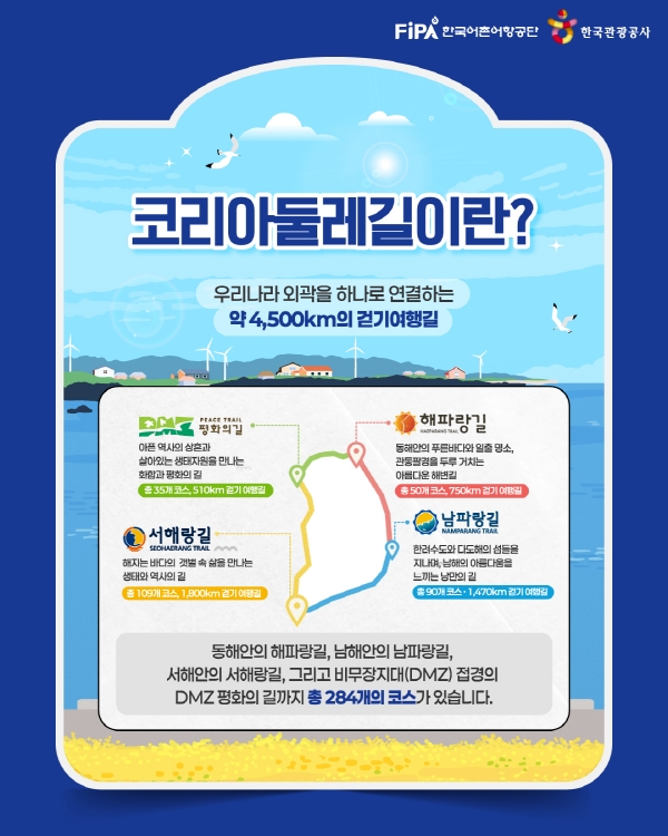 코리아둘레길은 동·서·남해안 및 DMZ 접경지역 등 전국 외곽을 연결하는 약 4500km, 284개 코스로 구성된 걷기여행길로, 많은 구간이 해안가 어촌체험휴양마을과 인접해 있어 자연과 문화를 동시에 체험할 수 있는 관광지로 주목받고 있다.