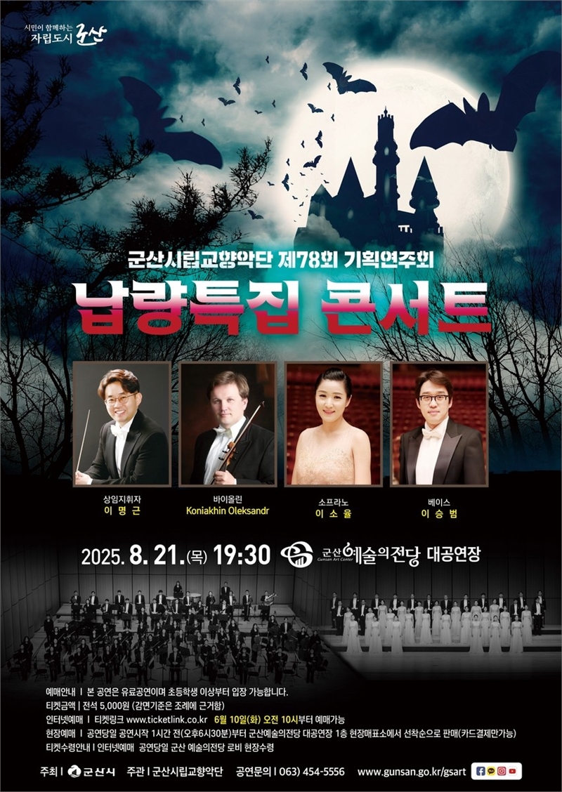 전북 군산시립교향악단은 여름철 무더위를 잊게 할 제78회 기획 연주회 ‘납량특집 콘서트’를 오는 8월 21일 오후 7시 30분, 군산예술의전당 대공연장에서 개최한다고 밝혔다.