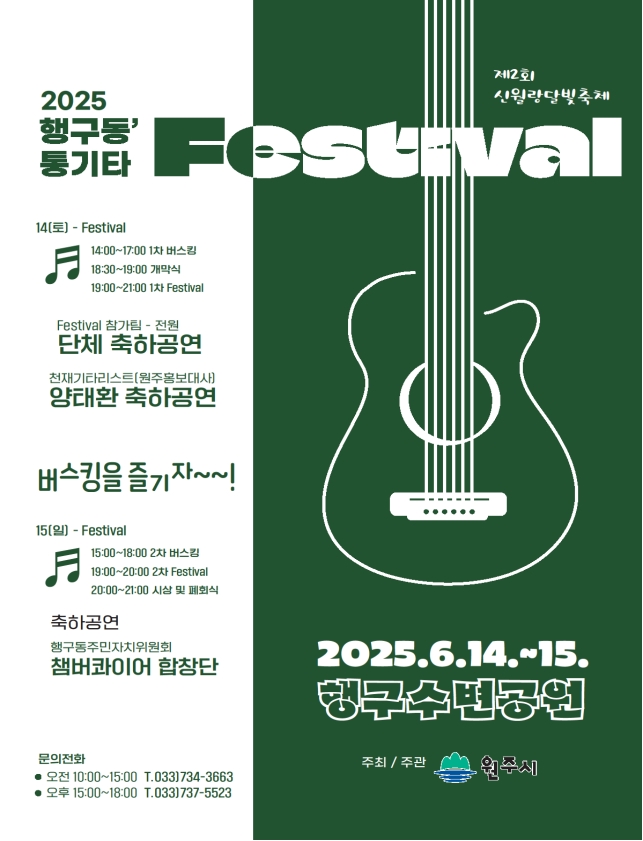 강원 원주시는 오는 14일(토)부터 15일(일)까지 이틀간 행구동 행구수변공원 일원에서 ‘제2회 신월랑 달빛 축제: 행구동 통기타 페스티벌’을 개최한다고 밝혔다.