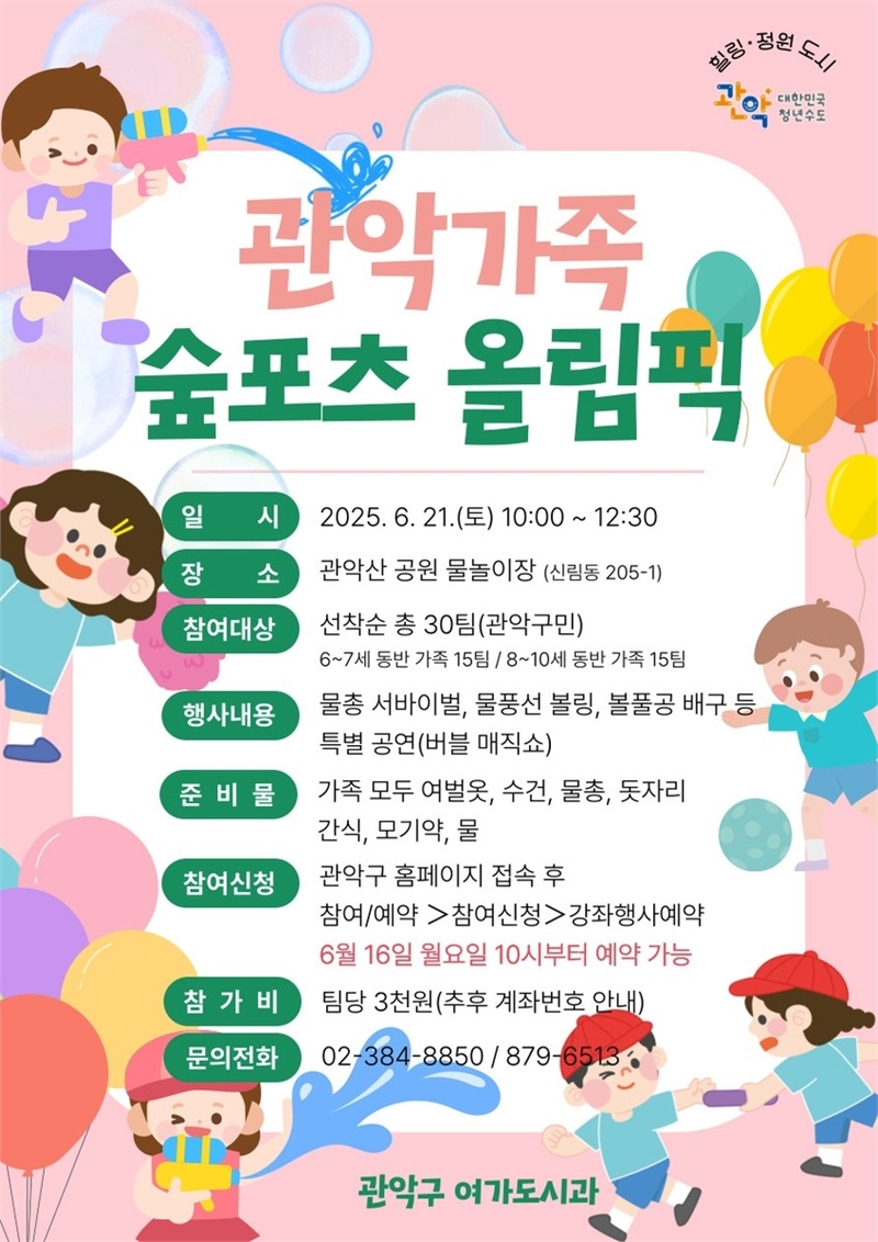 관악구는 오는 6월 21일 토요일 오전 10시부터 관악산공원 물놀이장에서 가족 단위 주민이 함께 참여할 수 있는 ‘가족 숲포츠 올림픽’을 개최한다고 밝혔다.