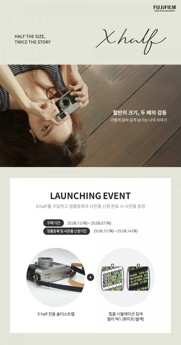 후지필름일렉트로닉이미징코리아(이하 후지필름 코리아)는 하프 프레임 디지털카메라 ‘X half’의 정식 출시를 맞아 오는 8월 7일까지 론칭 프로모션을 실시한다고 밝혔다.