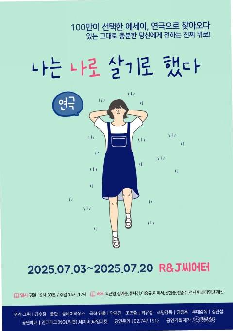 180만 독자의 마음을 사로잡은 김수현 작가의 베스트셀러 에세이 『나는 나로 살기로 했다』가 다시 한번 무대 위로 돌아온다. 연극 ‘나는 나로 살기로 했다’ 시즌3는 오는 7월 3일부터 20일까지 서울 대학로 R&J씨어터에서 관객들과 만난다.