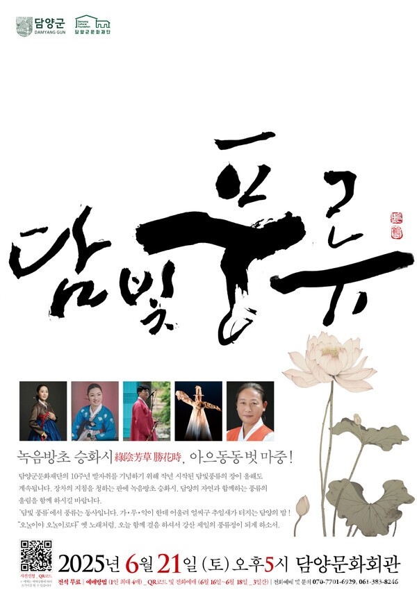 (재)담양군문화재단(이사장 정철원)은 오는 21일 오후 5시 담양문화회관 공연장에서 지역 대표 국악공연 ‘담빛풍류’를 개최한다고 밝혔다.