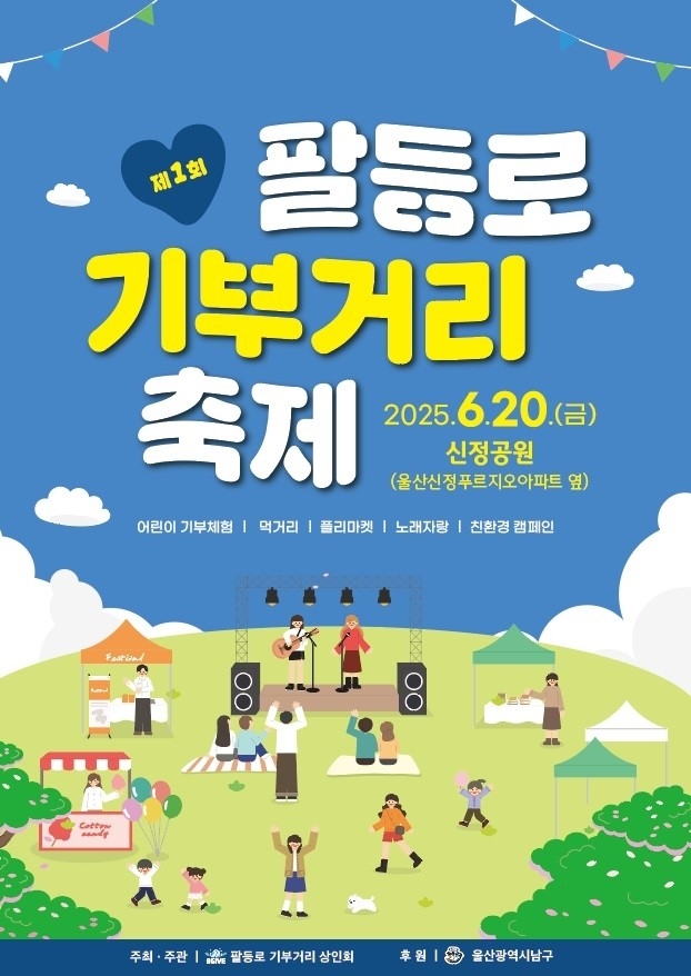 울산 남구가 골목상권 활성화와 지역경제 회복을 위해 마련한 ‘2025 팔등로 기부거리 축제’가 오는 6월 20일 팔등로 상권 및 신정공원 일원에서 열린다. 이번 축제는 ‘골목상권부활 프로젝트’ 제1탄으로, 팔등로 일대의 기부거리 상권을 널리 알리고 지역민의 소비를 촉진하기 위한 목적으로 기획됐다.