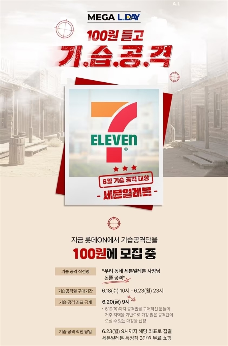 롯데쇼핑의 e커머스 플랫폼 롯데온(LOTTE ON)은 오는 23일 ‘메가 엘데이(Mega L.DAY)’를 맞아 편의점 세븐일레븐과 함께 특별 제휴 이벤트 ‘100원 들고 기습공격’을 진행한다고 밝혔다.