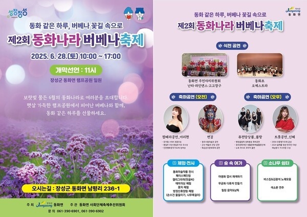 장성군 동화면은 오는 6월 28일 동화면 램프공원(남평리 236-1) 일원에서 ‘제2회 동화나라 버베나축제’를 연다고 밝혔다. 지난해에 이어 두 번째로 열리는 이번 축제는 보랏빛 버베나 꽃밭을 배경으로 다채로운 공연과 체험 프로그램이 어우러진 지역 대표 여름 축제로 자리매김할 전망이다.