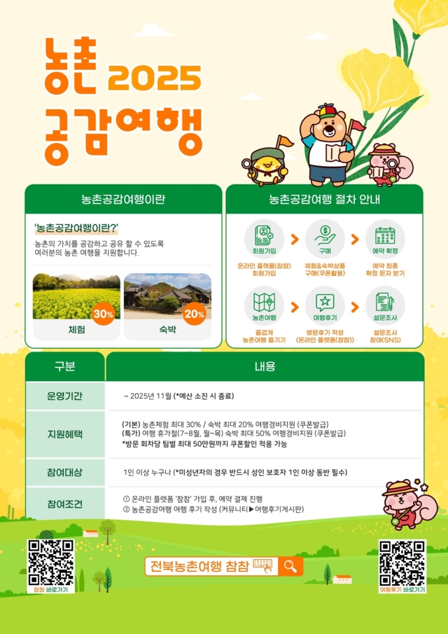 전북특별자치도가 농촌관광 활성화를 위해 ‘2025년 농촌공감여행 경비지원 사업’을 본격 추진한다. 특히 여름 휴가철을 맞아 오는 7월부터 8월까지는 평일 숙박비를 최대 50%까지 할인해주는 특별 프로모션도 함께 진행된다.