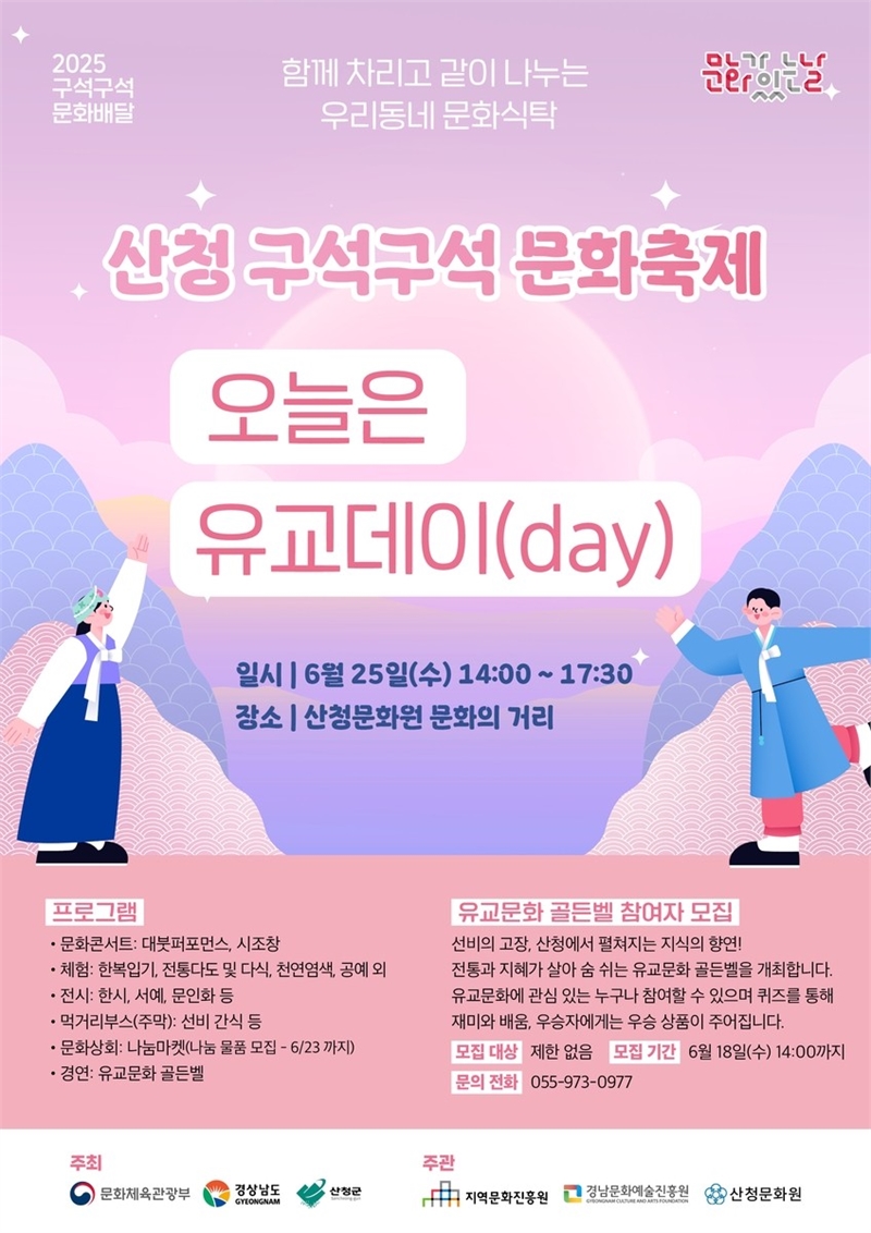 산청군은 오는 25일 산청읍 문화의 거리에서 ‘산청 구석구석 문화배달’ 행사를 개최한다고 밝혔다.