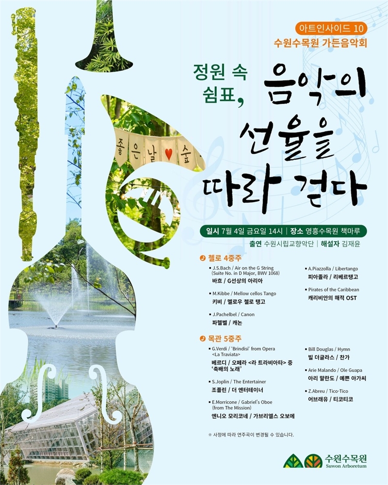 수원시는 오는 7월 4일 오후 2시, 수원 영흥수목원 방문자센터 책마루에서 ‘정원 속 쉼표, 음악의 선율을 따라 걷다’라는 주제로 가든음악회를 개최한다고 밝혔다.