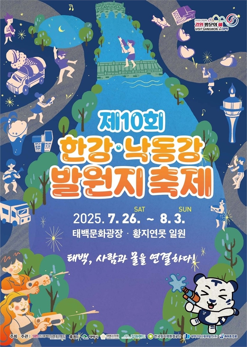 한강·낙동강 발원지 축제는 오는 7월 26일부터 28일까지 태백 문화광장과 황지연못 일대에서 펼쳐진다. 축제는 '워터데이앤나잇', '수맥페스티벌' 등 물을 테마로 한 체험 프로그램과 공연으로 구성돼 한여름 더위를 식혀줄 다채로운 즐길거리를 선보일 예정이다. 공식 포스터는 여름 체험 요소와 수계 도시 이미지를 감각적인 일러스트로 담아 관심을 끌고 있다.